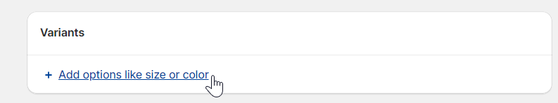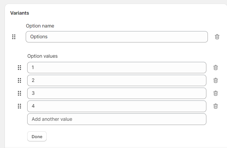 Click on "+ Add options like size or color". Type the option name as you wish, we will use "Options" as the sample. Add the option values and click on Done.