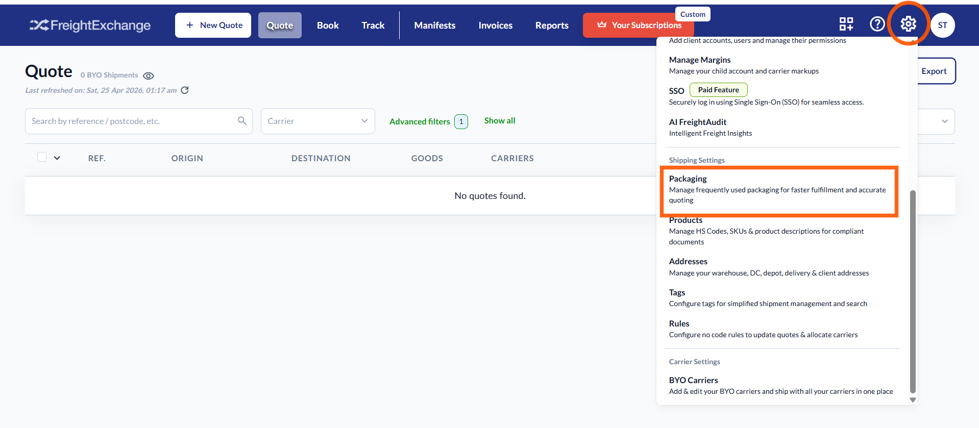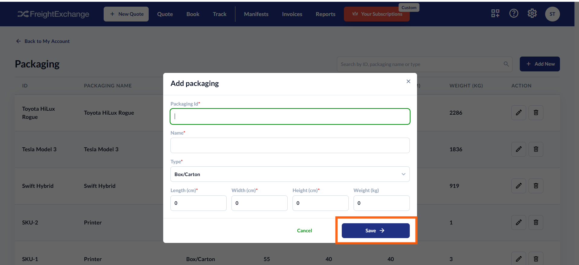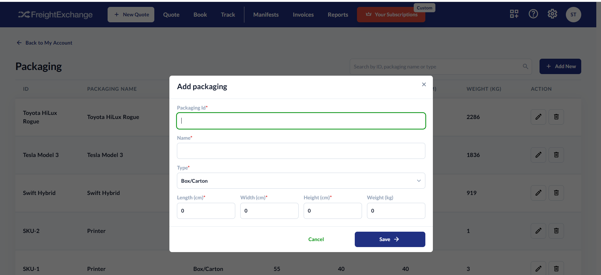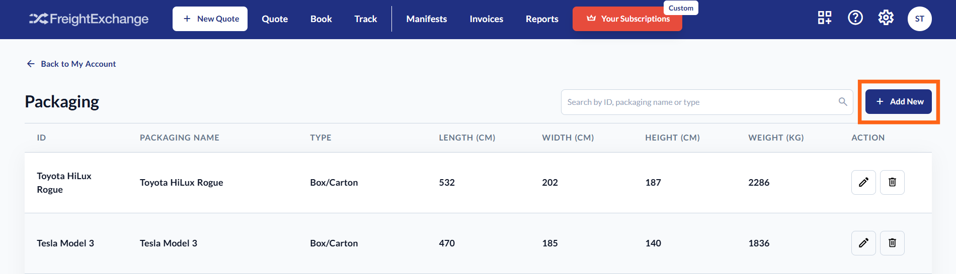 FreightExchange gives you the ability to add your packaging settings to manage frequently used packages for faster order fulfilment and accurate quoting.
