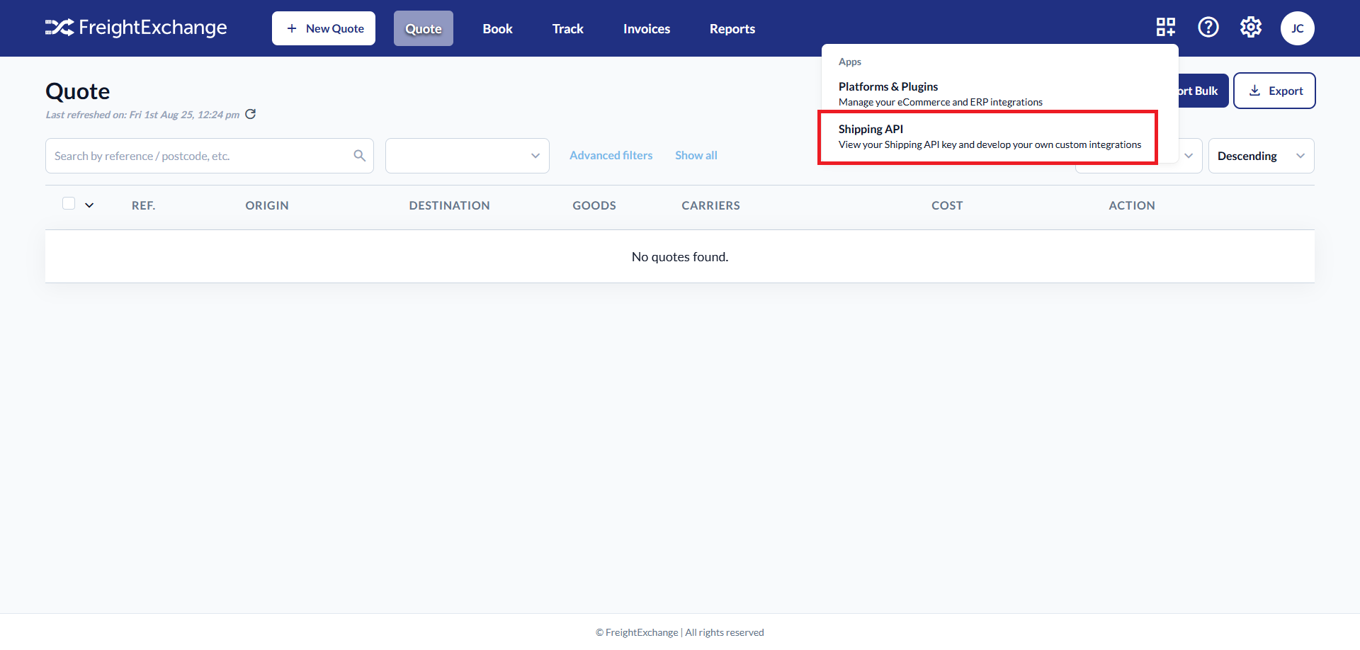 The FreightExchange API provides a powerful and flexible way to integrate your own systems with the FreightExchange platform. By using API keys, you can programmatically connect your website, e-commerce store, or enterprise resource planning (ERP) system to access FreightExchange's core functionalities. This allows you to streamline your shipping workflows, automate tasks, and provide a seamless experience for your customers.