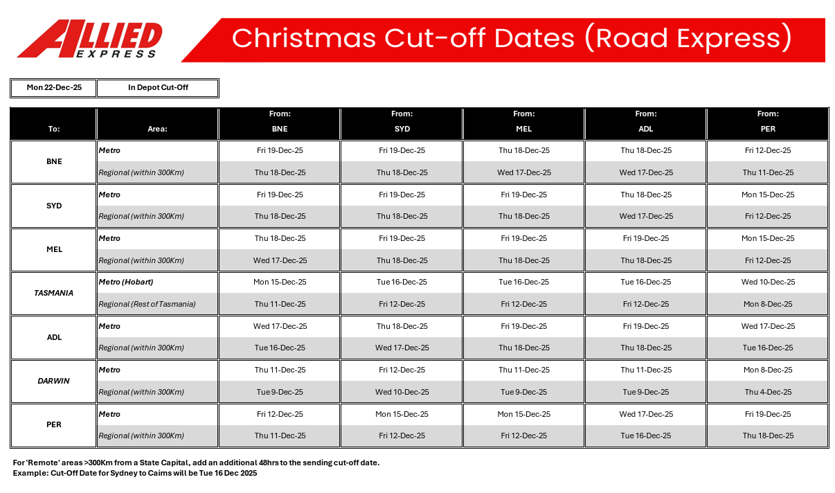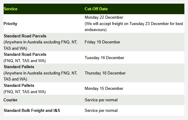 Please be advised that we have revised our seasonal operational plan to include Pickups & Deliveries (PUD) on Christmas Eve 24 December. Our interstate linehaul operations are not scheduled to occur that evening so please plan accordingly as interstate freight will be held until linehaul recommences on Monday 29 December.