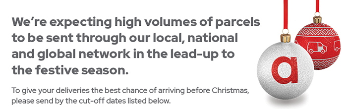 To help ensure your parcels arrive in time for Christmas, we encourage you to send them as early as possible. Please click here to view Pre-Christmas delivery cut-off dates.