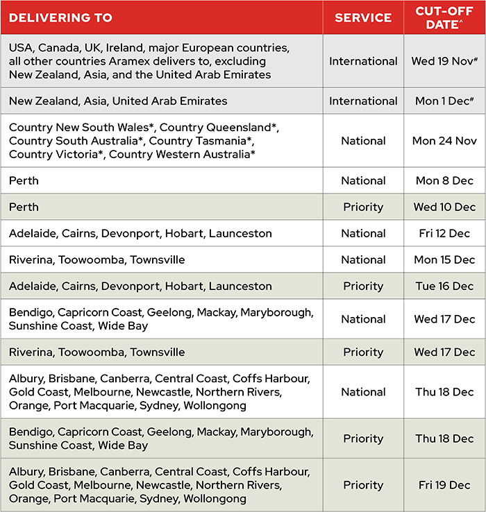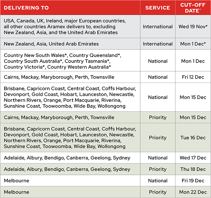 # Cut-off dates listed for international deliveries are applicable to shipments sent from Melbourne.