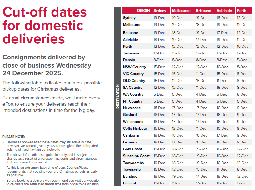 - 15th December 2025 when shipping between Melbourne, Sydney, Brisbane & Adelaide