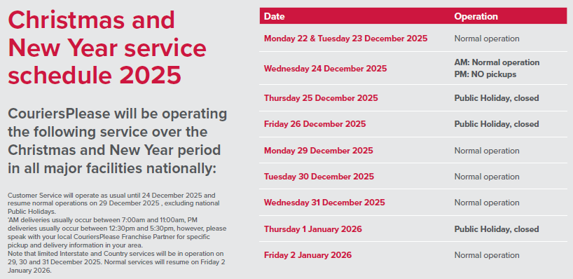 Priority and Standard Road Parcel permanent collections will be suspended (excluding Medical and Government freight sent through our Priority network) from 27 December 2025 to 4 January 2026 inclusive. They will resume on Monday 5 January 2026.